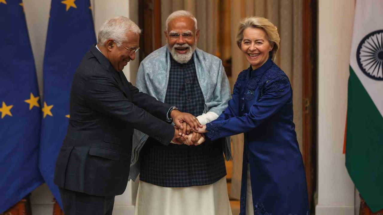 Avrupa Birliği (AB) liderleri, ABD Başkanı Donald Trump'ın yaptırım tehditleri gölgesinde Hindistan'da tarihi bir ticaret anlaşmasına imza attı. Avrupa Birliği (AB) Konseyi Başkanı Antonio Costa, AB Komisyonu Başkanı Ursula von der Leyen ve Hindistan Başbakanı Narendra Modi, başkent Yeni Delhi'de gerçekleştirilen Hindistan-AB Zirvesi'nde 'tüm anlaşmaların anası' olarak tanımlanan tarihi serbest ticaret anlaşmasını ve karşılıklı iş birliğine ilişkin belgeler imzaladı. Liderler imza töreninin ardından ortak basın toplantısı düzenledi.