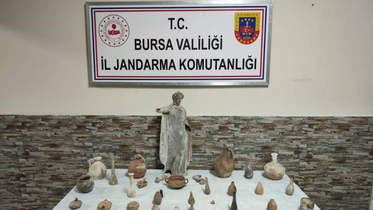 Nilüfer’de jandarma ekiplerinin düzenlediği operasyonda Roma ve Bizans dönemlerine ait olduğu değerlendirilen 29 obje ve 60 santimetre uzunluğunda bir heykel ile el dedektörü ele geçirildi.