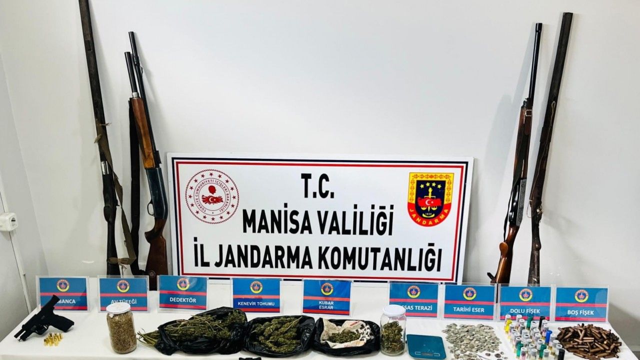 Manisa’nın Salihli ilçesinde jandarma ekipleri tarafından düzenlenen operasyonda yasadışı madde, tarihi eser, silah ve dedektörler ele geçirildi.
