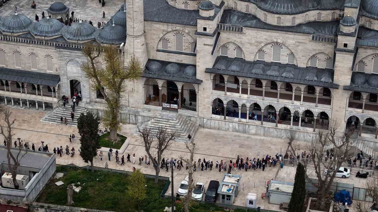 Sultanahmet Camii'nde restorasyon çalışmalarının tamamlanmasının ardından artan ilgiyle birlikte cami çevresinde uzun ziyaretçi kuyrukları oluştu. Tarihi ibadethane havadan görüntülenirken, yerli ve yabancı turistlerin yoğunluğu dikkat çekti.