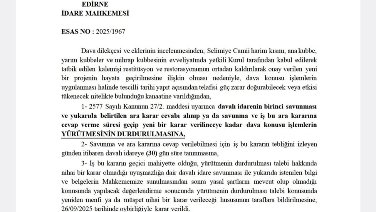 UNESCO Dünya Kültür Mirası Listesi’nde yer alan ve Mimar Sinan’ın "ustalık eserim" dediği Selimiye Camii’nde restorasyon sürecinde kubbe yazılarında yapılması planlanan değişikliğe Edirne İdare Mahkemesi "dur" dedi. Mahkeme, yürütmenin durdurulmasına karar verdi. Mahkeme ayrıca kubbe yazılarında yapılmak istenen değişiklik için yürütmeyi durdurdu.