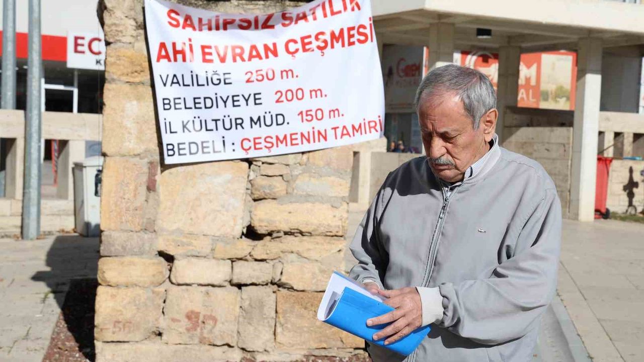 KIRŞEHİR (İHA) - Kırşehir'de Ahi Evran Külliyesi'nde yer alan tarihi çeşmenin bakımsızlığına dikkat çekmek isteyen Ahmet Fahri Ekim, suyu akmayan çeşmeye pankart asarak tek kişilik eylem gerçekleştirdi.